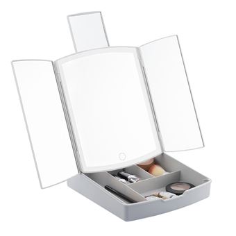 Maquillez-vous rapidement et facilement avec ce miroir de maquillage pratique. Le design intelligent a un miroir central et deux rétroviseurs latéraux qui peuvent être facilement pliés et dépliés. De plus, il possède un petit miroir coulissant au dos avec un grossissement x7. L'éclairage LED intégré est contrôlé par une commande tactile et dispose de trois réglages d'éclairage différents (froid, chaud et lumière du jour). La lampe est alimentée soit par USB soit par batterie (non incluse). Le miroir dispose également d'un compartiment de rangement astucieux pour vos produits.