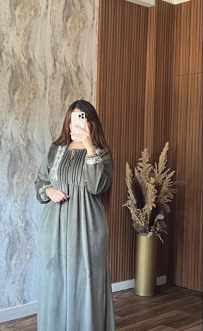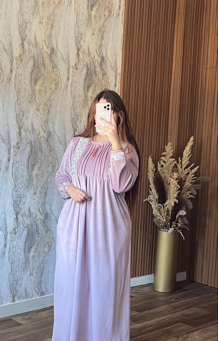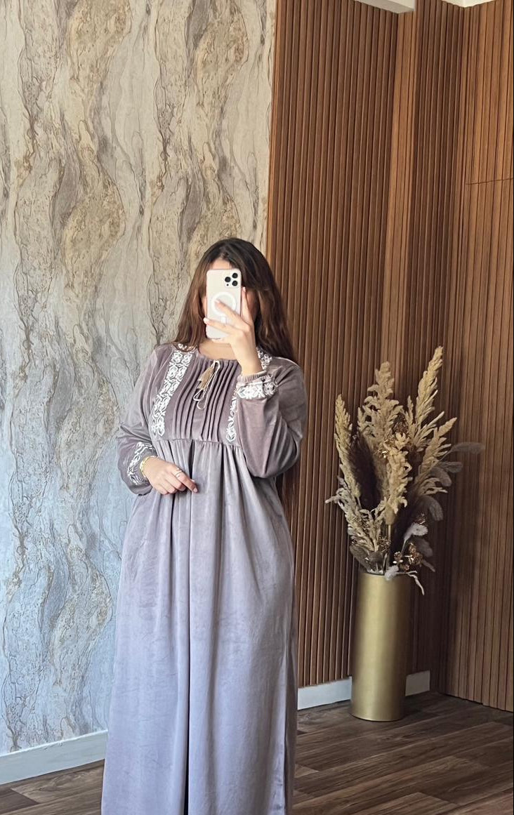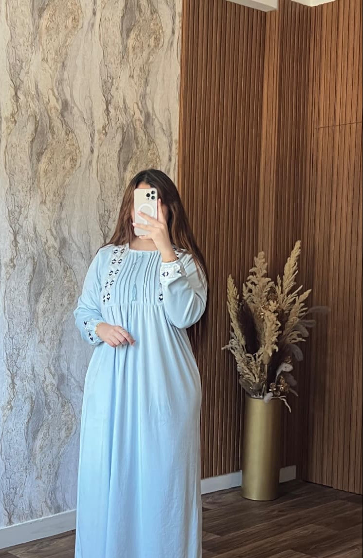 Ses détails brodés blancs au niveau du col et des manches apportent une touche raffinée et féminine, tandis que sa coupe longue et fluide garantit une aisance parfaite.